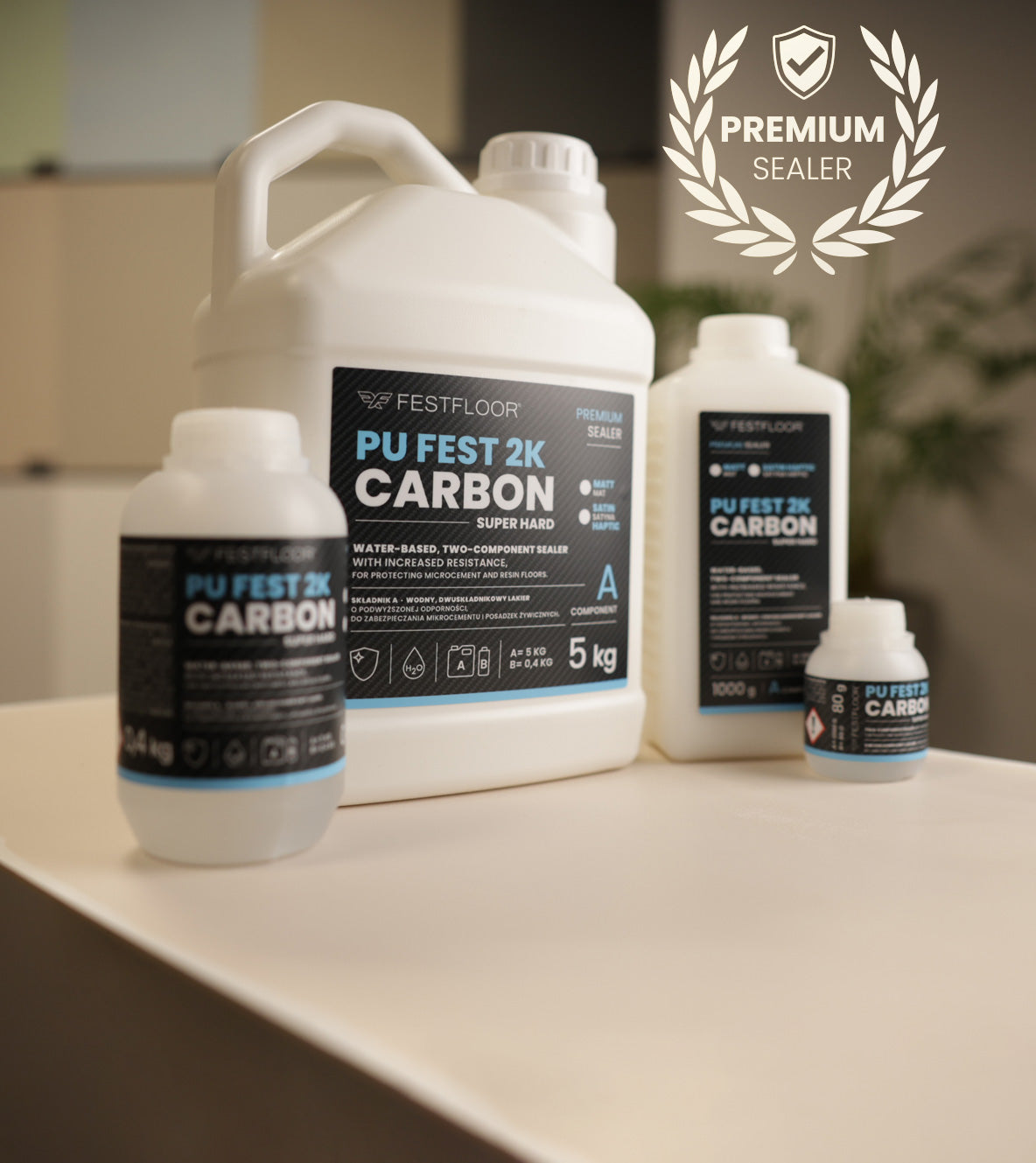 PU FEST 2K CARBON is a waterborne two-component varnish/sealer designed for the protection and finishing of microcement and resin floors. Its polycarbonate formula provides exceptional hardness, abrasion resistance, and a perfectly smooth surface. It combines the durability of industrial coatings with the aesthetics of modern interiors.