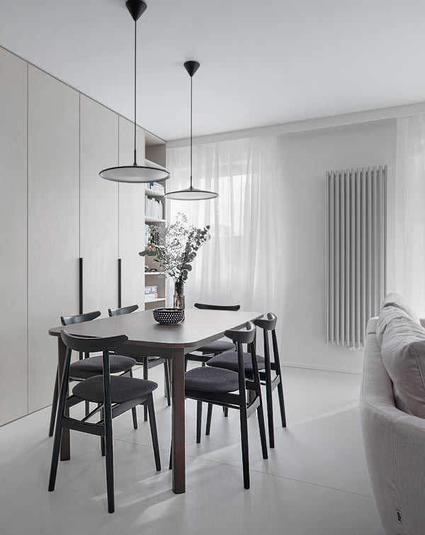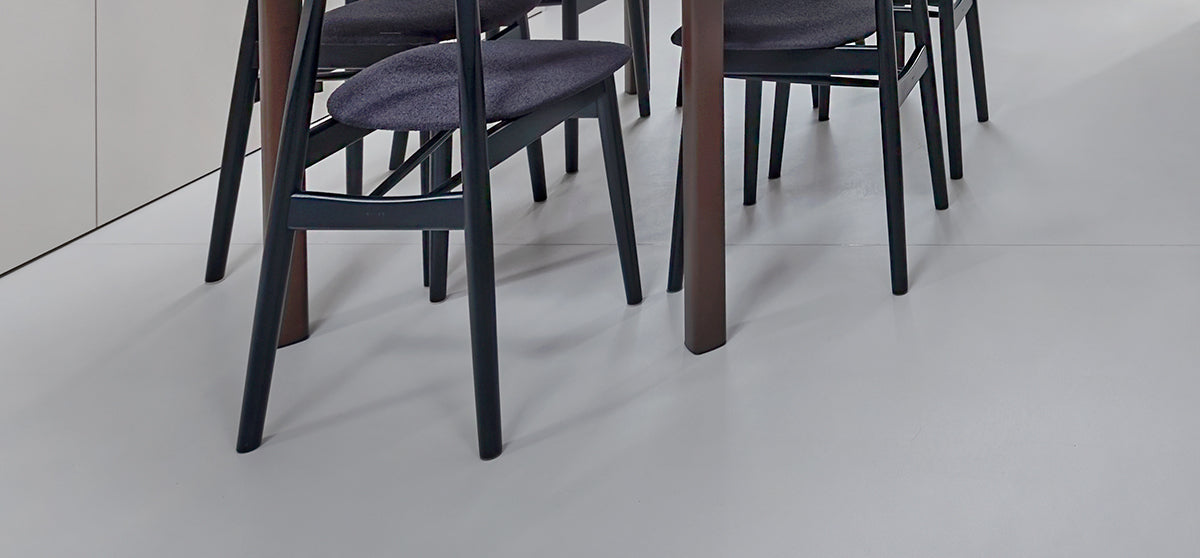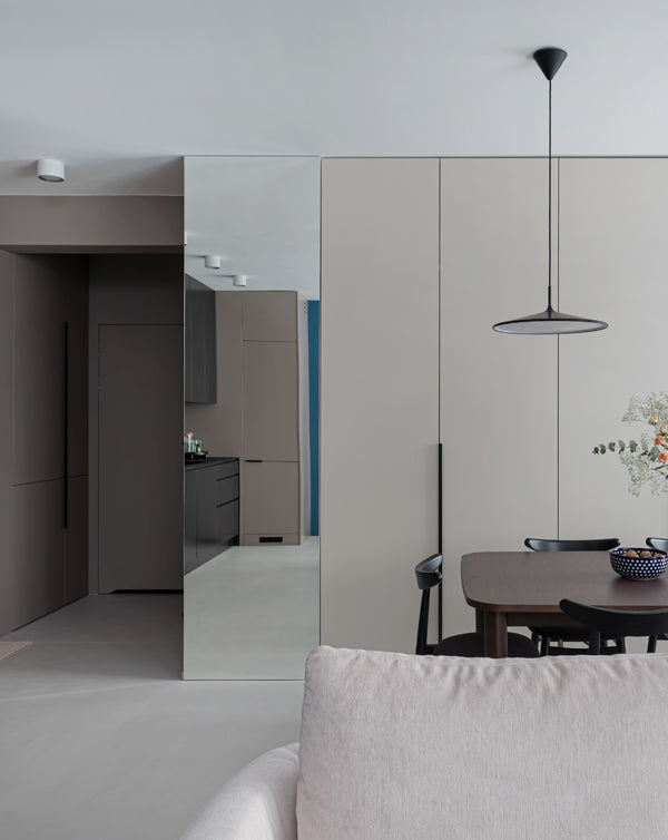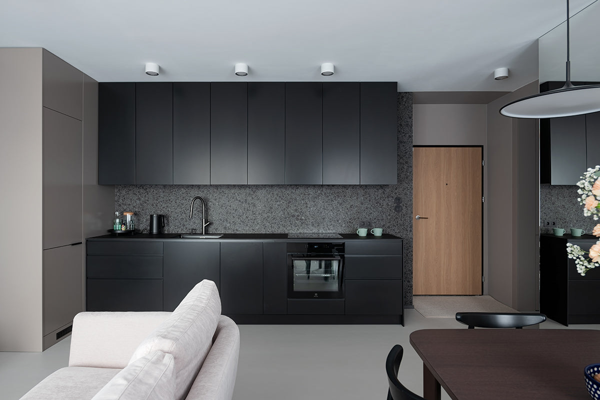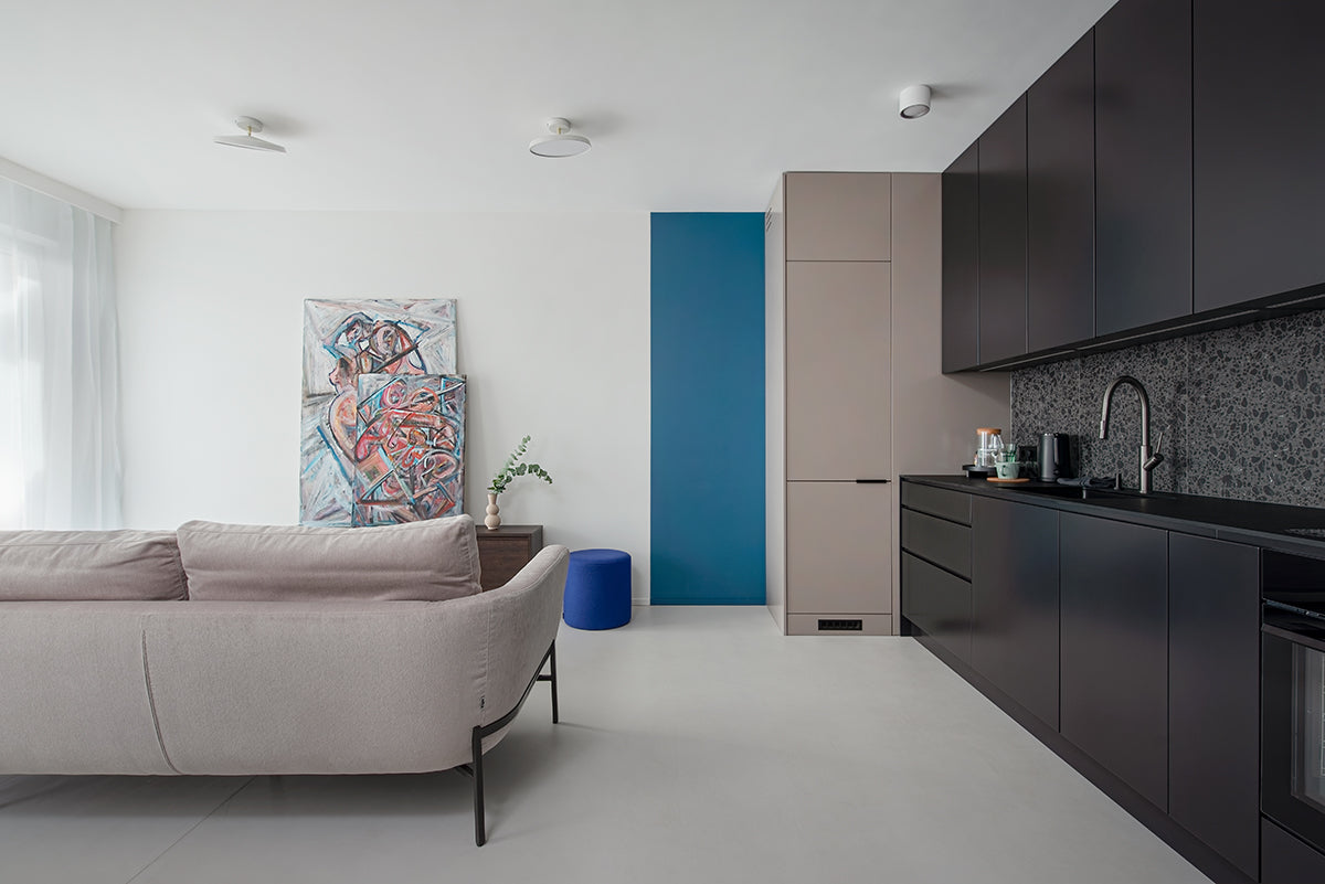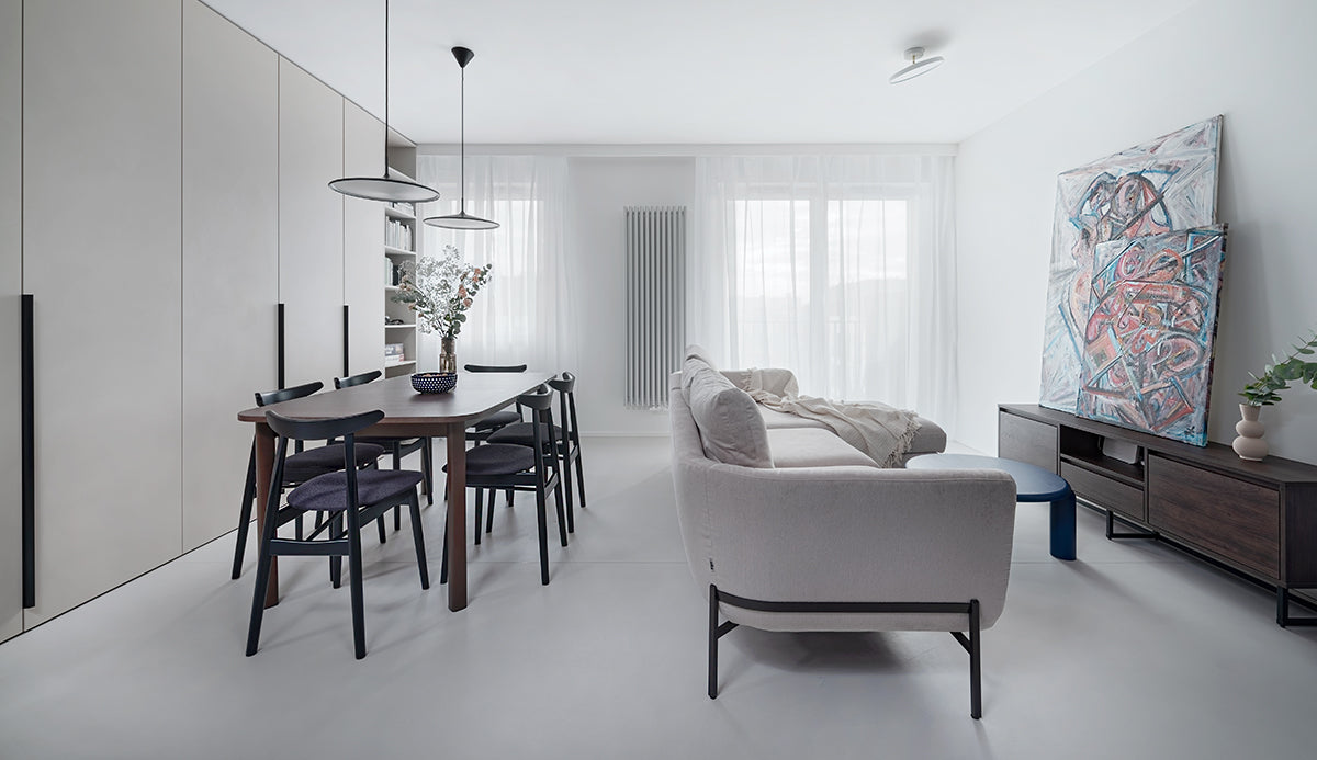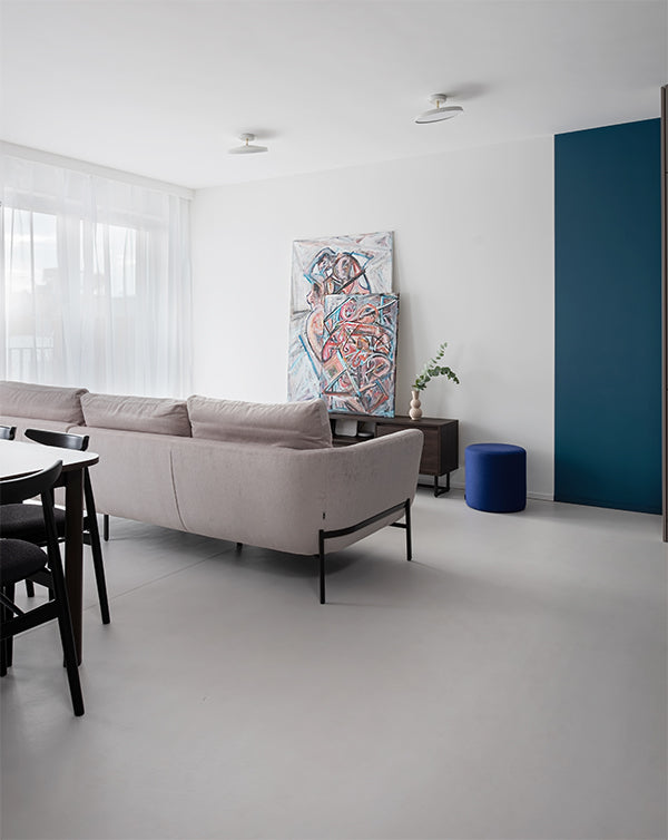 In this arrangement, the microcement floor seamlessly blends the various interiors to create a harmonious space. The delicate FL03 July Beige color that covers the floor illuminates each room, providing a neutral backdrop for the carefully selected furnishings. The living area, comprising the living room, kitchen and dining room, acts as the heart of the apartment. A soft sofa in pastel tones invites relaxation, while its muted color creates a calm atmosphere. The minimalist lines of the furniture are complemented by careful details and soft lighting, which together create a balanced aesthetic composition.
