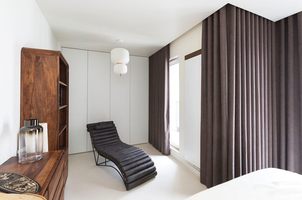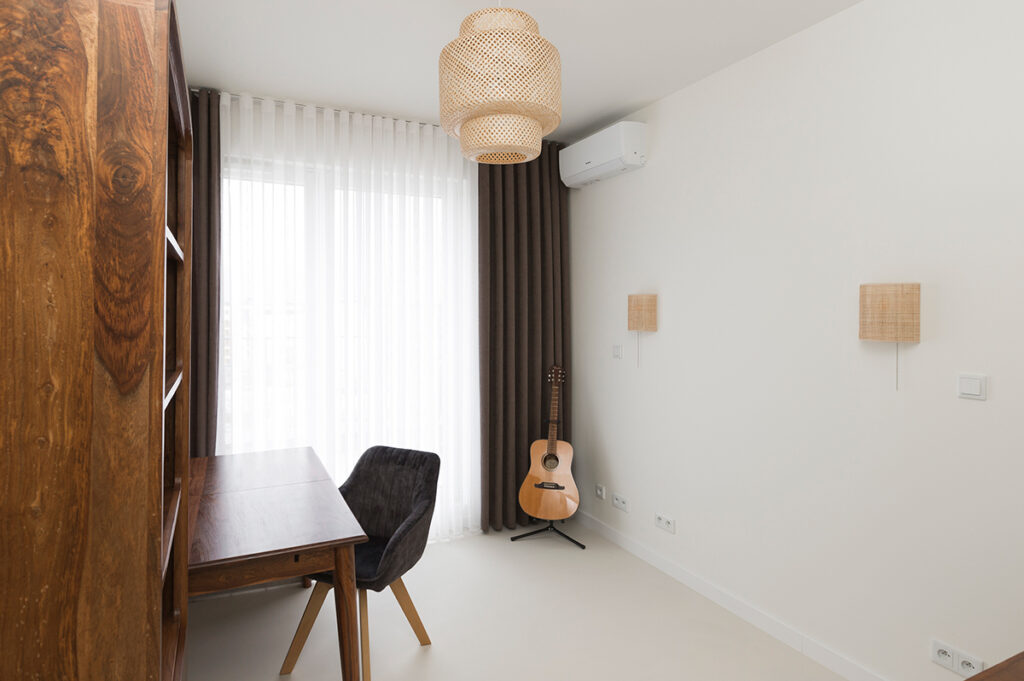 Every home must also not lack a bedroom – a place where we rest and regenerate our strength. That is why it is so important that it is decorated in a way that promotes our comfort and relaxation. In this bedroom, everything has been perfectly composed so that it is a coherent part of the whole house. The elegant white bed that is the focal point of the room, set on a sleek microcement floor, evokes an immediate desire to relax, like in a luxury hotel. Stylish furnishings, such as the abstract painting kept in muted colours, solid wood furniture with rounded shapes and heavy brown curtains, add intimacy and privacy to the room. Delicate openwork and wicker lamps give the interior a pleasantly warm and atmospheric feel. All this adds up to an ideal place for relaxation and regeneration.