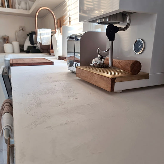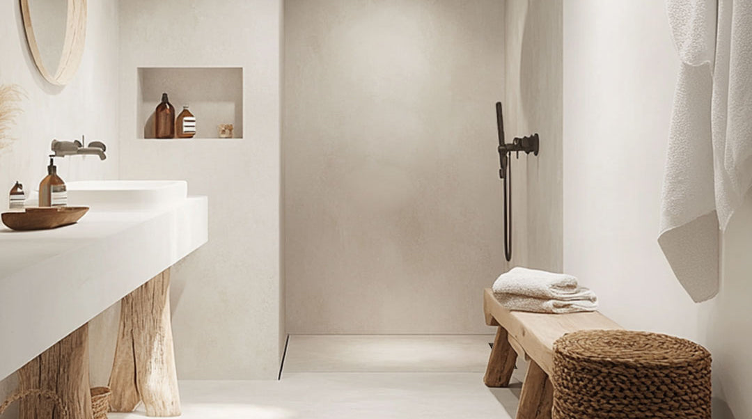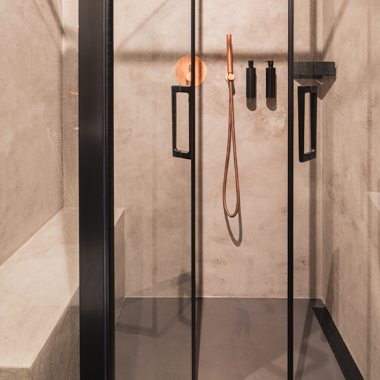 Creating a shower area in the bathroom requires special attention, especially when it comes to protection against moisture. In wet zones such as the shower, it is essential to use materials that effectively guard against water exposure. For these applications, we recommend bathroom microcement, HydroFest-a material that does not require full waterproofing, only the use of waterproofing tapes at wall joints, wall-to-floor connections, and around the drain. The floor and wall in the shower, finished with water-resistant HydroFest microcement, are both durable and visually appealing.