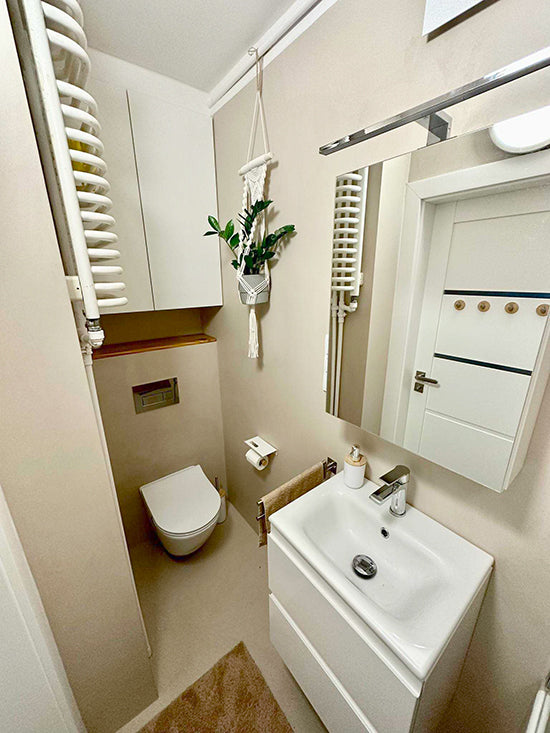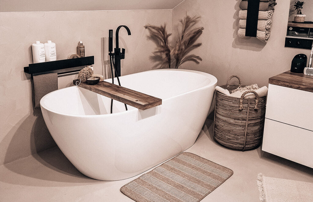 – Boho style bathroom – beige microcement fits perfectly into this style of interior design. Microcement surfaces provide the perfect backdrop for natural decorative elements, such as wood.
