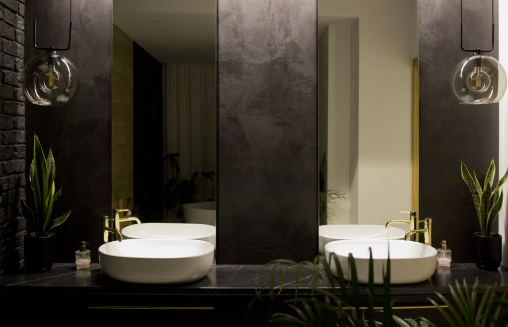 – Industrial style bathroom – the raw aesthetics and burn-through effect on microcement harmonize with the factory-inspired style.