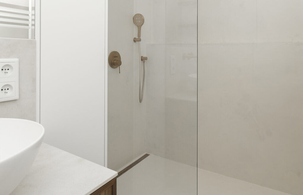 Replacing a traditional shower tray with a walk-in finished with microcement makes the shower user-friendly and clean. By using microcement on the walls, floor and shower in the bathroom, you will add cohesion to the interior and optically enlarge the small space.