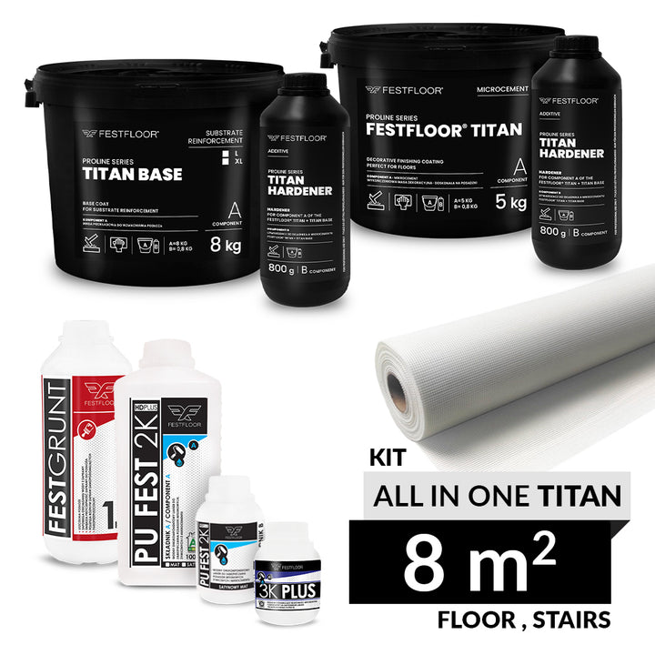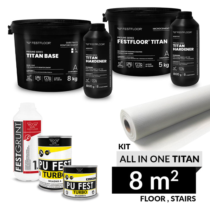 ALL IN ONE TITAN je komplexná sada produktov na vytvorenie mimoriadne odolnej a pevnej mikrocementovej podlahy s rozlohou 8 m². Je to odporúčaná sada v systéme FESTFLOOR TITAN, určená pre povrchy vystavené intenzívnemu používaniu, ako sú podlahy v kanceláriách, bytoch a komerčných priestoroch, ako aj schody alebo pracovné dosky. Sada je ideálna aj pre priestory vystavené intenzívnemu používaniu, poskytuje vysokú odolnosť voči poškodeniu a oderu.